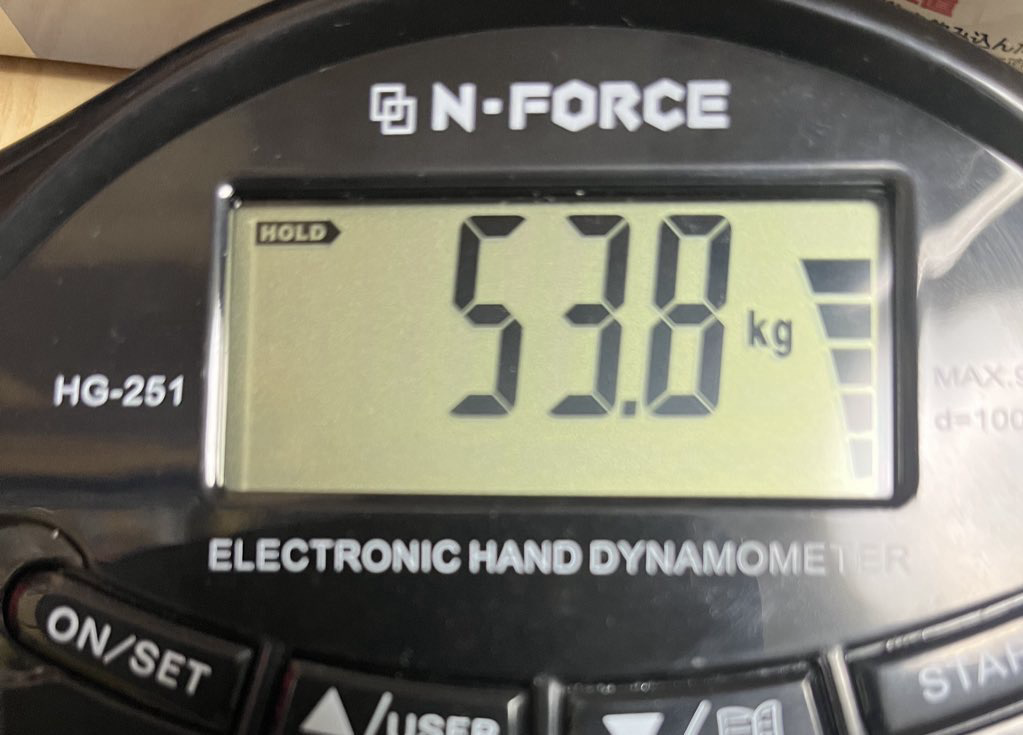 趣味筋トレ(握力)、53.8kg出て記録更新した