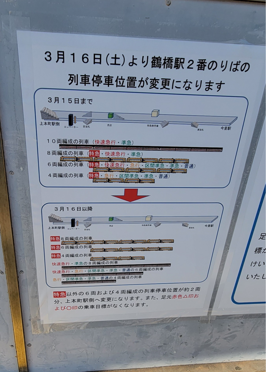 例の、ホームでうろついていたら怒鳴られたと言われる場所、JRに乗り換える階段の位置や工事用資材の仮覆いの関係で大変難しい話になっている。そもそも近鉄の4ドア車のドアが環状線の橋脚に被ってるってどういうことだよw (止め方によって回避できるが、基本は被る位置に停車) #鶴橋駅