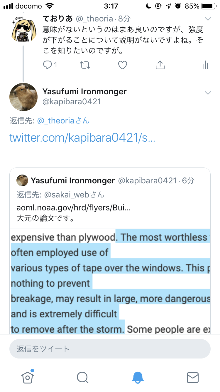 虫セロー1050 (@MUSHIserow) のツイート, 10月11日 15:54 - 『台風の時窓ガラスにテープを貼る』とか『ダンボールをあてがう』とか飛散防止には色々な方法があるみたいだけど、マットレスを窓側に立て掛けておくと迫撃砲弾の破片も防げる、とアフガン帰りの人から聞いたことがある。