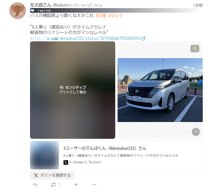 草。セレナの補助席はMisskey.ioだとセンシティブらしい