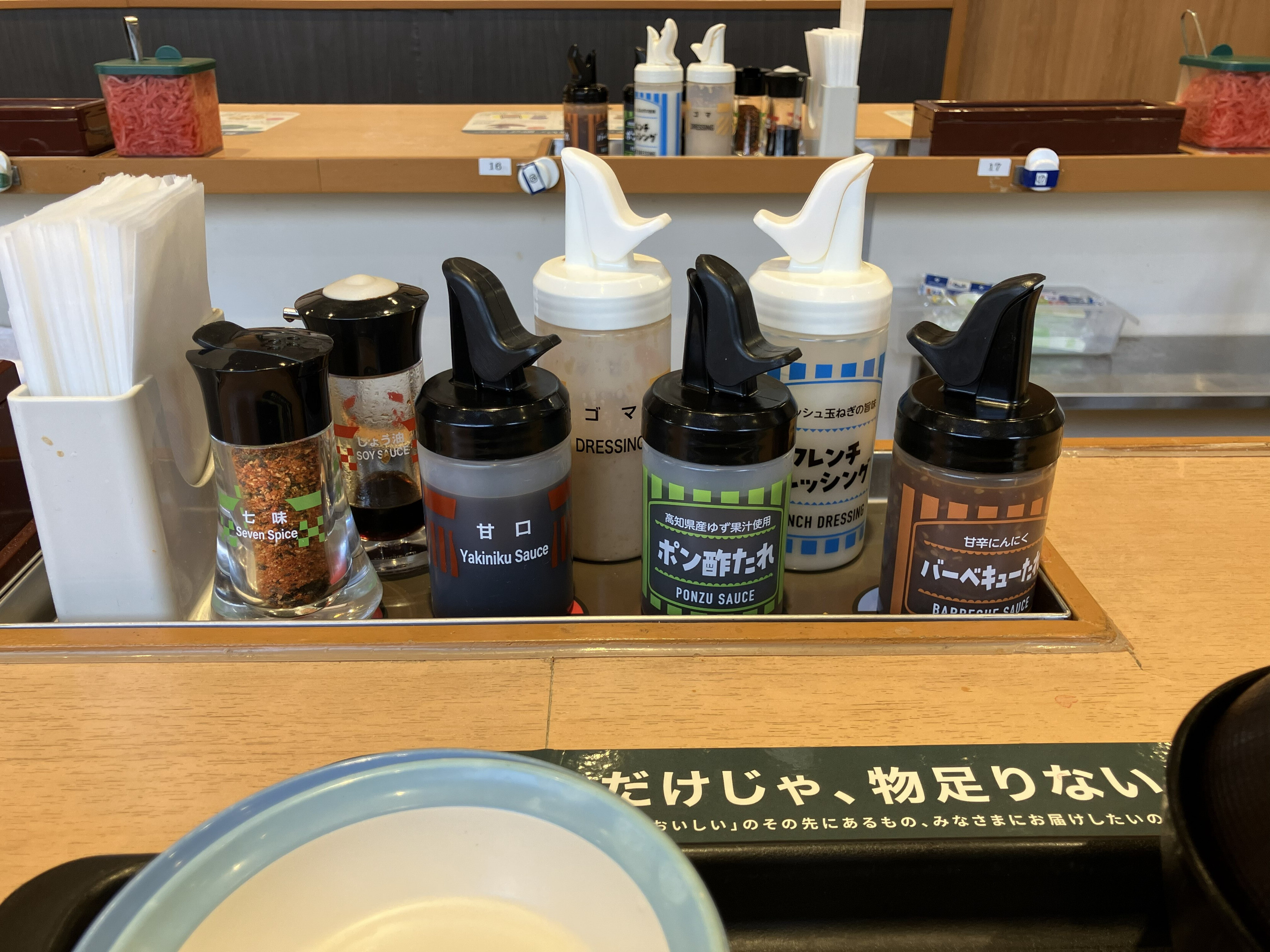 今では珍しいフルサービス店舗。写真1枚目右手にキッチン、その手前にお弁当コーナーがあり、お弁当コーナー側から1 - 19, 9-12が頂点となるUの字テーブルが設置されている。券売機はキッチン反対側の角にクレジットカード・現金対応の券売機が計2台設置されている。キッチンが片揃えのため川崎銀座街店を90°回した形でのセルフサービス店への移行は簡単と思われる。それはそうとなんだこのフレンチドレッシングなどの容器は。セルフサービス店にしては珍しく給茶機が設置されているが、何なんだこの薄さは