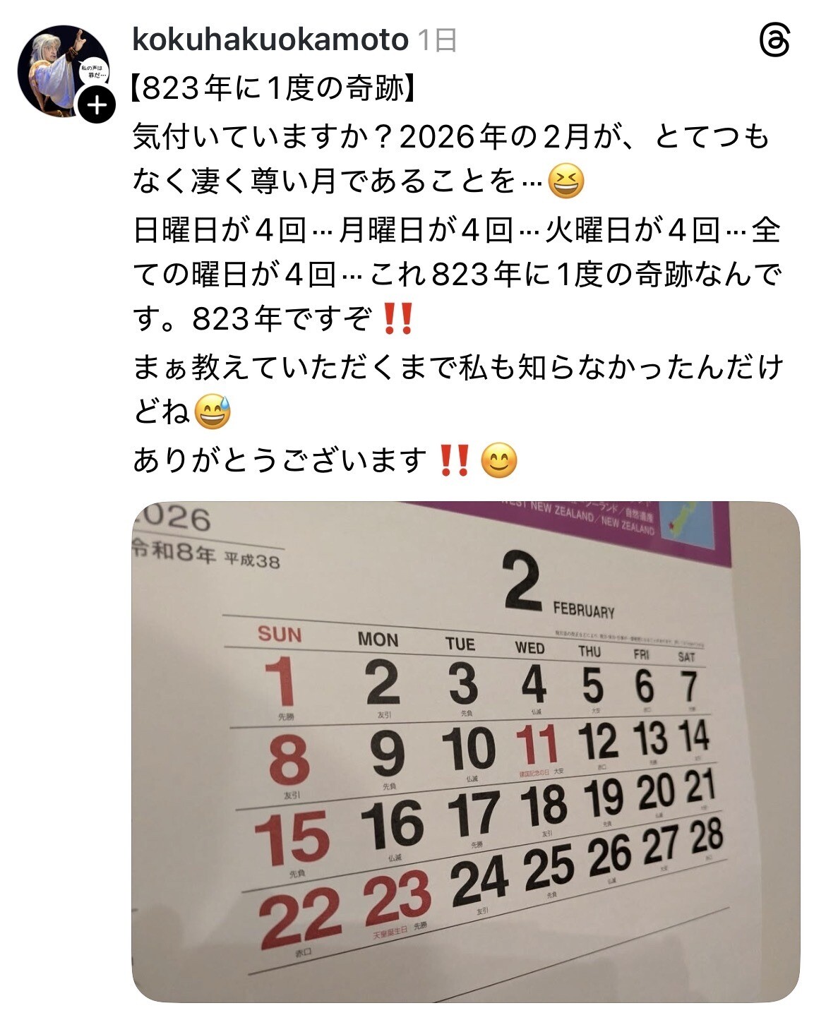 「「 【823年に1度の奇跡】 気付いていますか? 2026年の2月が、とてつもなく凄く尊い月であることを・・・ 」 これほんま?