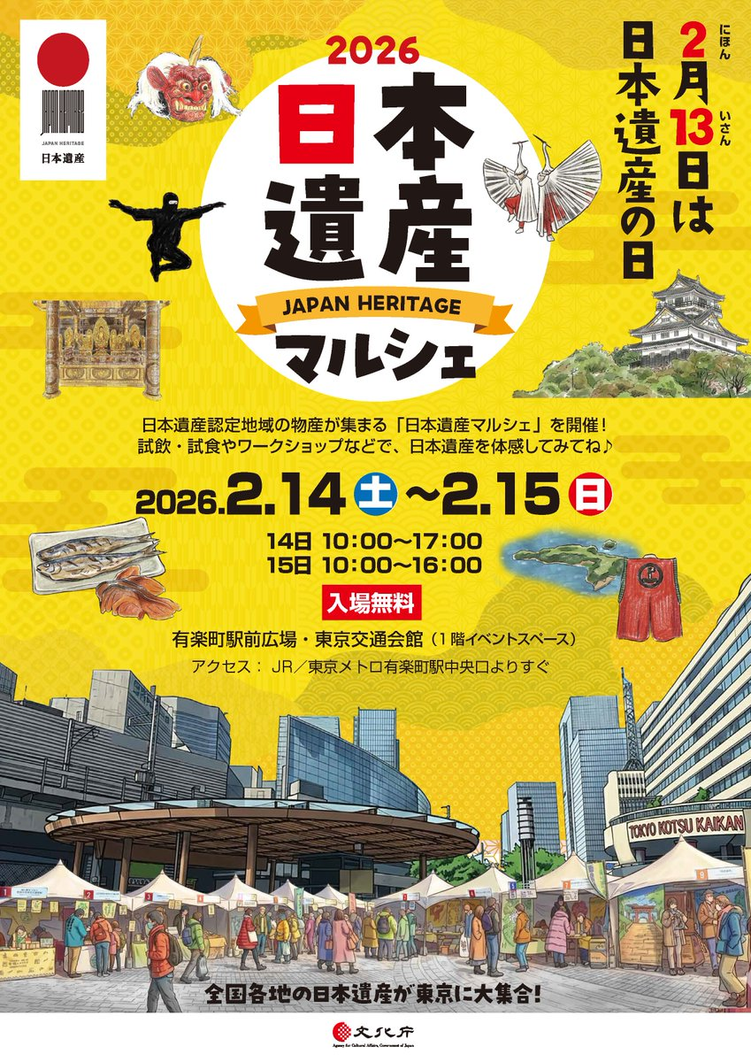 [Xユーザーの文化庁さん: 「【全国各地の日本遺産が東京に大集合!】 「2026日本遺産マルシェ」を開催✨ 2月13日は 🔸開催日:2026年2月14日(土)10:00~17:00、 2月15日(日)10:00~16:00 🔸場所:有楽町駅前広場・東京交通会館(1階イベントスペースほか) 🔸アクセス:JR/東京メトロ有楽町駅中央口よりすぐ t.co/lolS92VK67」 / X]( x.com/prmag_bunka/status/20186 )