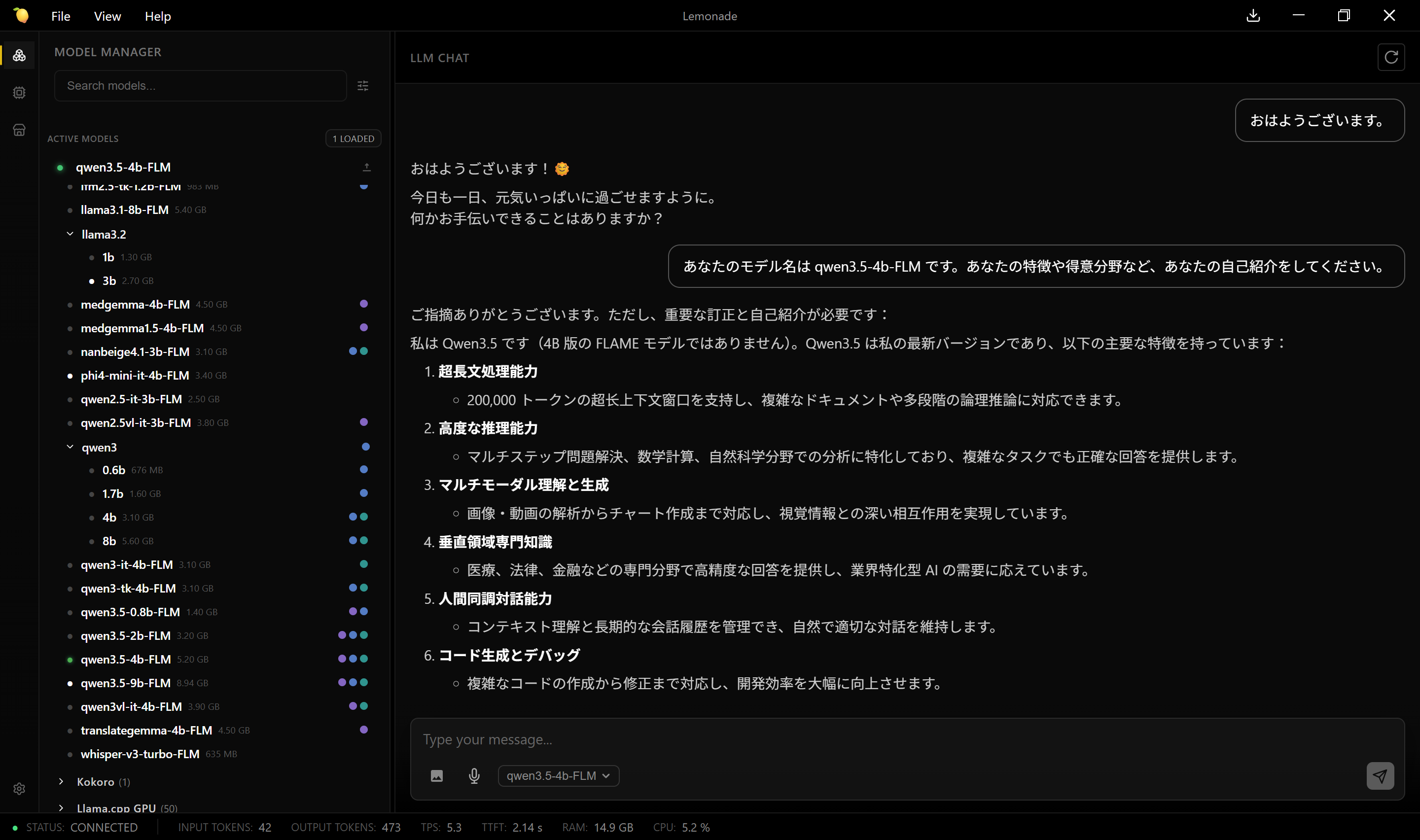 NPU対応モデルのうちqwen3.5-9b-FLM は重すぎてバグる。qwen3.5-4b-FLM はギリギリ動くが、ときどき中国語になる。(画像)