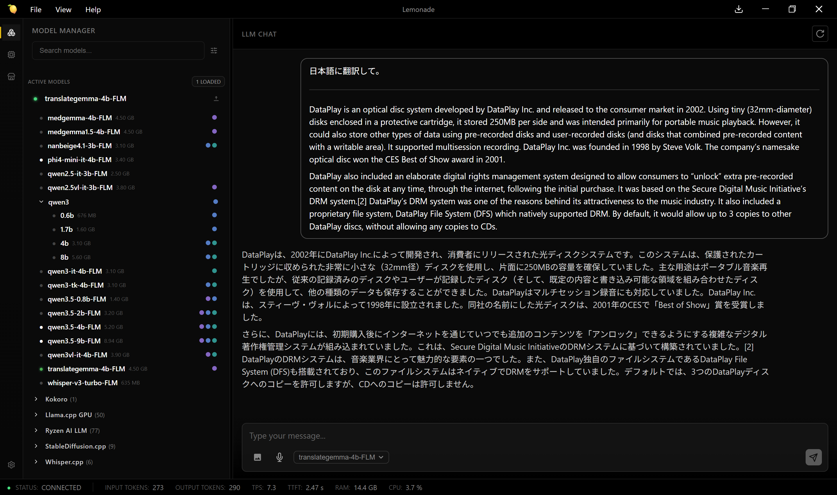 translategemma-4b-FLM (NPU翻訳)は実用的な精度と速度で使えることを確認。これは凄い。