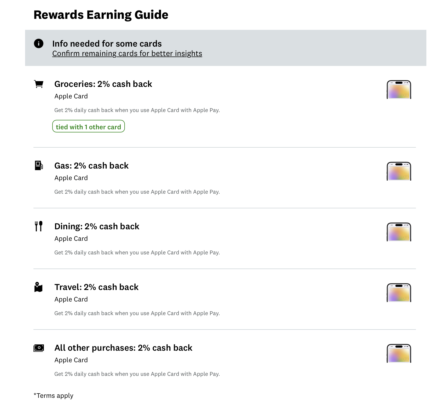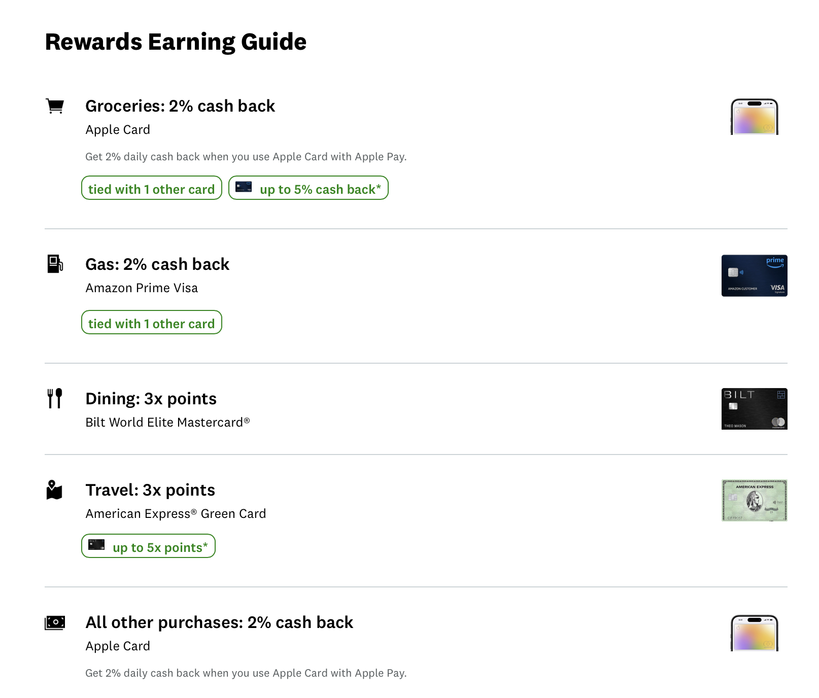「日用品におすすめのカード? Apple Cardだね」「ガソリンにおすすめのカード? Apple Cardだね」「外食におすすめのカード? Apple Cardだね」