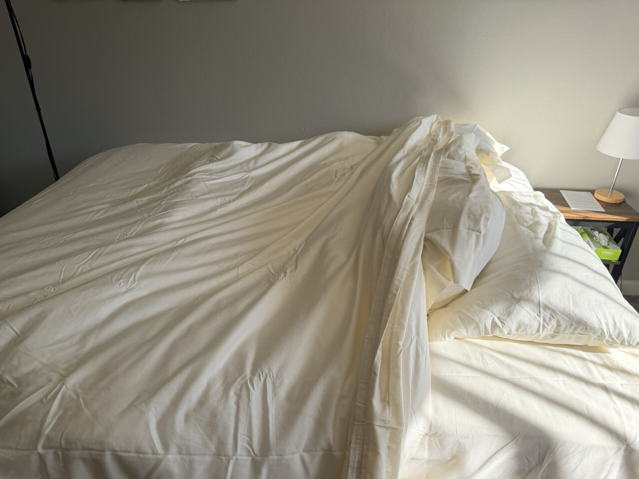 明るいところで見たらベッドシーツの上下の色が合ってなかったので交換。白とアイボリーなんてややこしい色買うからこうなるんですよ