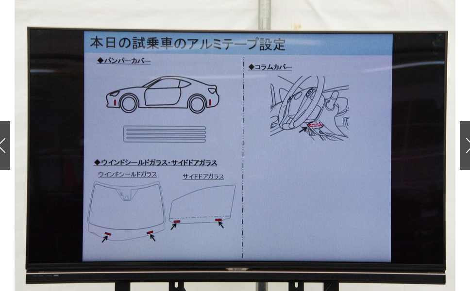 今回の改良86の車体には、両サイドウインドウ下部とステアリング下コラムカバー内の計3か所にアルミテープが貼られている(肉眼で見ることはできない)のみだが