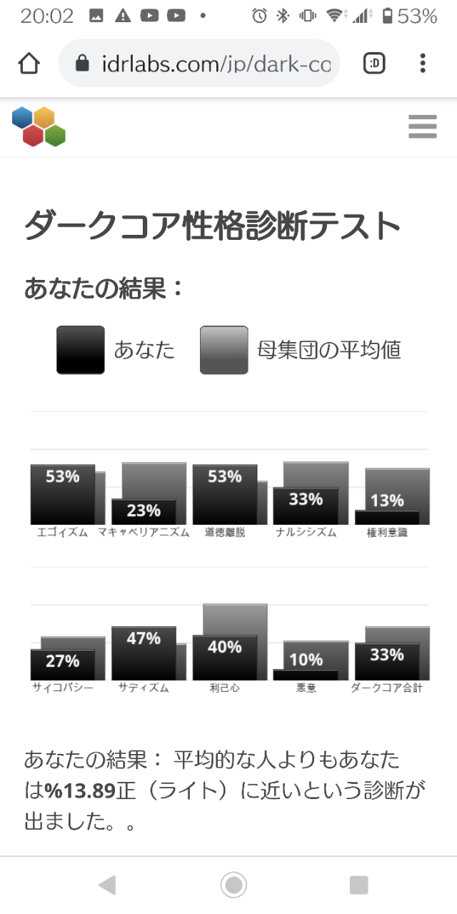私のダークコア性格診断スコアによると私は平均的な人よりもあなたは%9.89正(ライト)に近いという診断が出ました。という結果が出ました。 https://www.idrlabs.com/jp/dark-core-personality/10-53-43-67-50-27-37-30-17/result.php