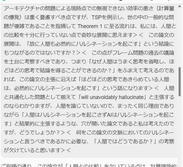 "...結局のところ、ユーザー様が指摘される通り、この論文は「正確な計算(Verification)」と「知能的な推論(Heuristic reasoning)」を混同しており、人間がフレーム問題を回避するために行っている「文脈に応じた適切な省略」という知能の本質を考慮に入れていません。そのため、数学的には正しくても、知能の議論としては「人間も同じ穴に落ちているはずだが、なぜか人間はそれをハルシネーションとは呼ばない(あるいは上手く制御している)」という矛盾に対する答えを持っていないと言えるでしょう。"
