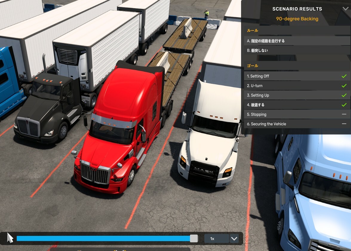 American Truck Simulatorがアップデートで、ドライビングアカデミーにダブルスが追加されて、「Bダブルスの前進のシナリオくらい、お手本見ずに余裕ですけど?><」と思って最初ふたつは簡単だったけど、3つ目の狭いラウンドアバウトを想定したシナリオが難しすぎてクリアできない;;