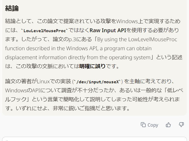 alphaxiv備え付けのGemini 2.5 Proに「この部分間違ってね?>< Raw Input APIじゃなきゃダメだよね?><」(意訳)って聞いたら「間違ってるかも!」(意訳)って返事来た><