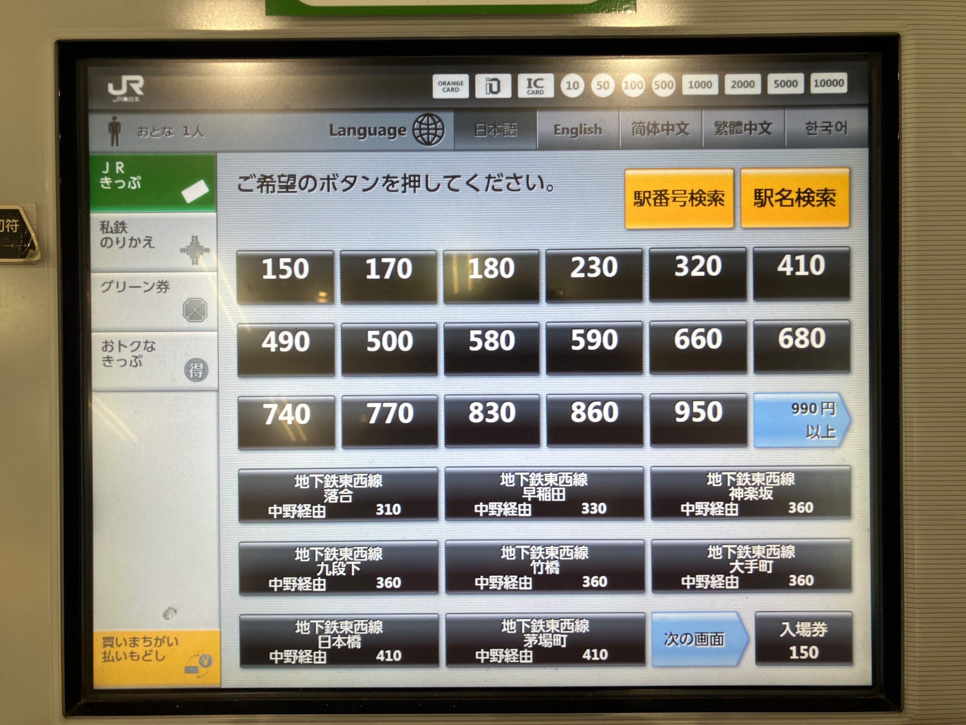 Q: あなたは #高円寺駅 の #近距離券売機 で #東京メトロ 東西線経由 #西船橋駅 までのきっぷを買おうとしています。この画面が表示されている場合、次に何を押せばよい?