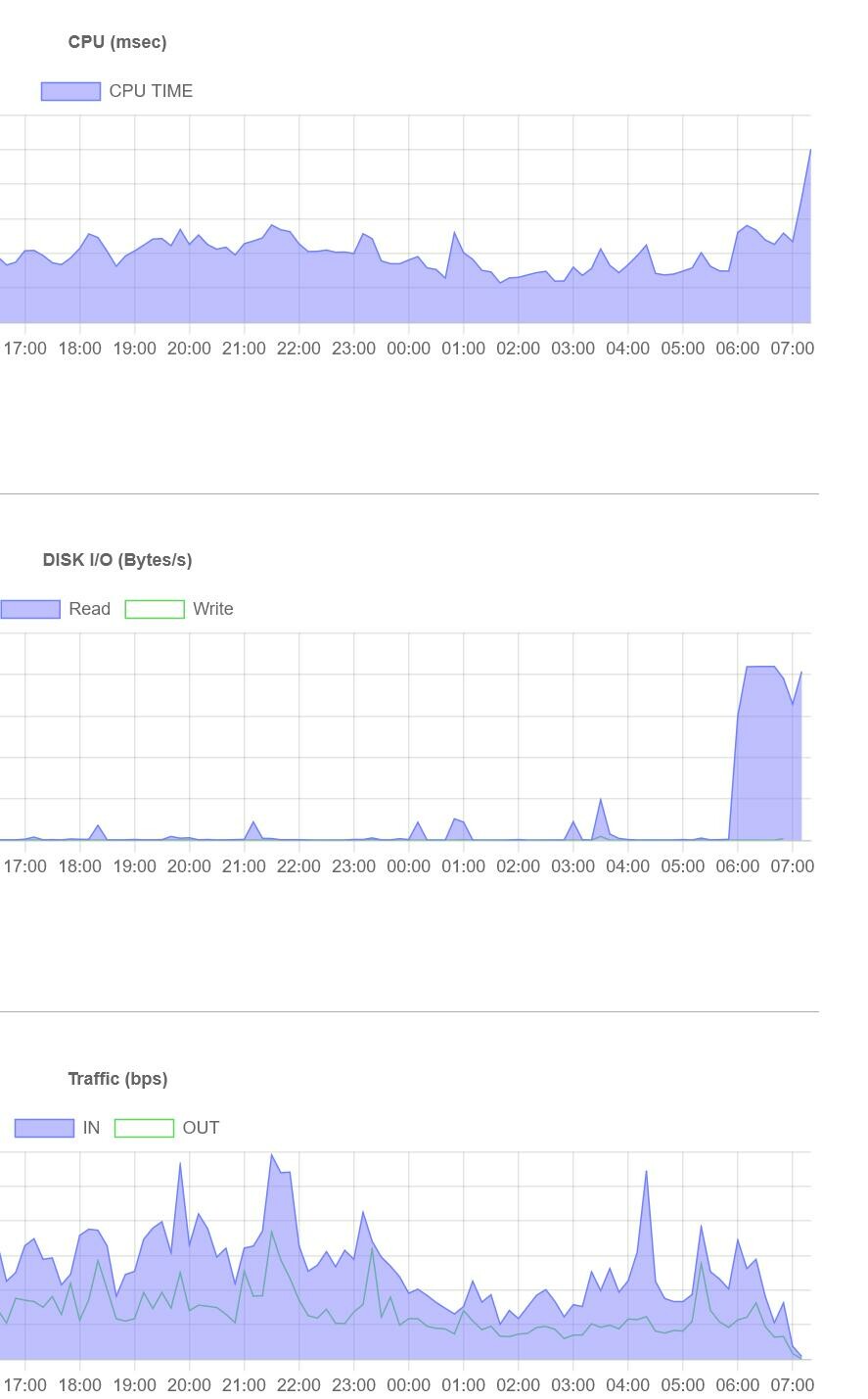 はい復帰。zabbixの警告も6時ぐらいからディスク負荷を通知し始めて、7時から接続不可を通知してた。