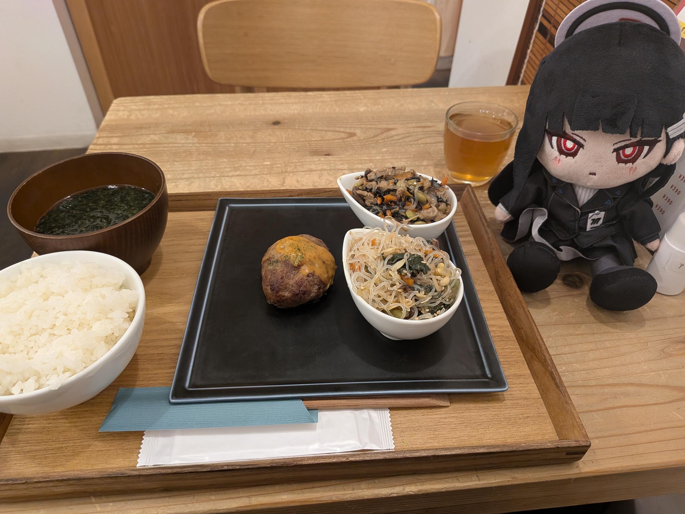 これはこのお店のシステムが関係していて、ハンバーグもサラダも煮物も対等な「1品」で様々な候補から合計3品選ぶ定食だったのでこのように注文したところ、ハンバーグが小ぶりでサラダと煮物が大盛りという結果になった。