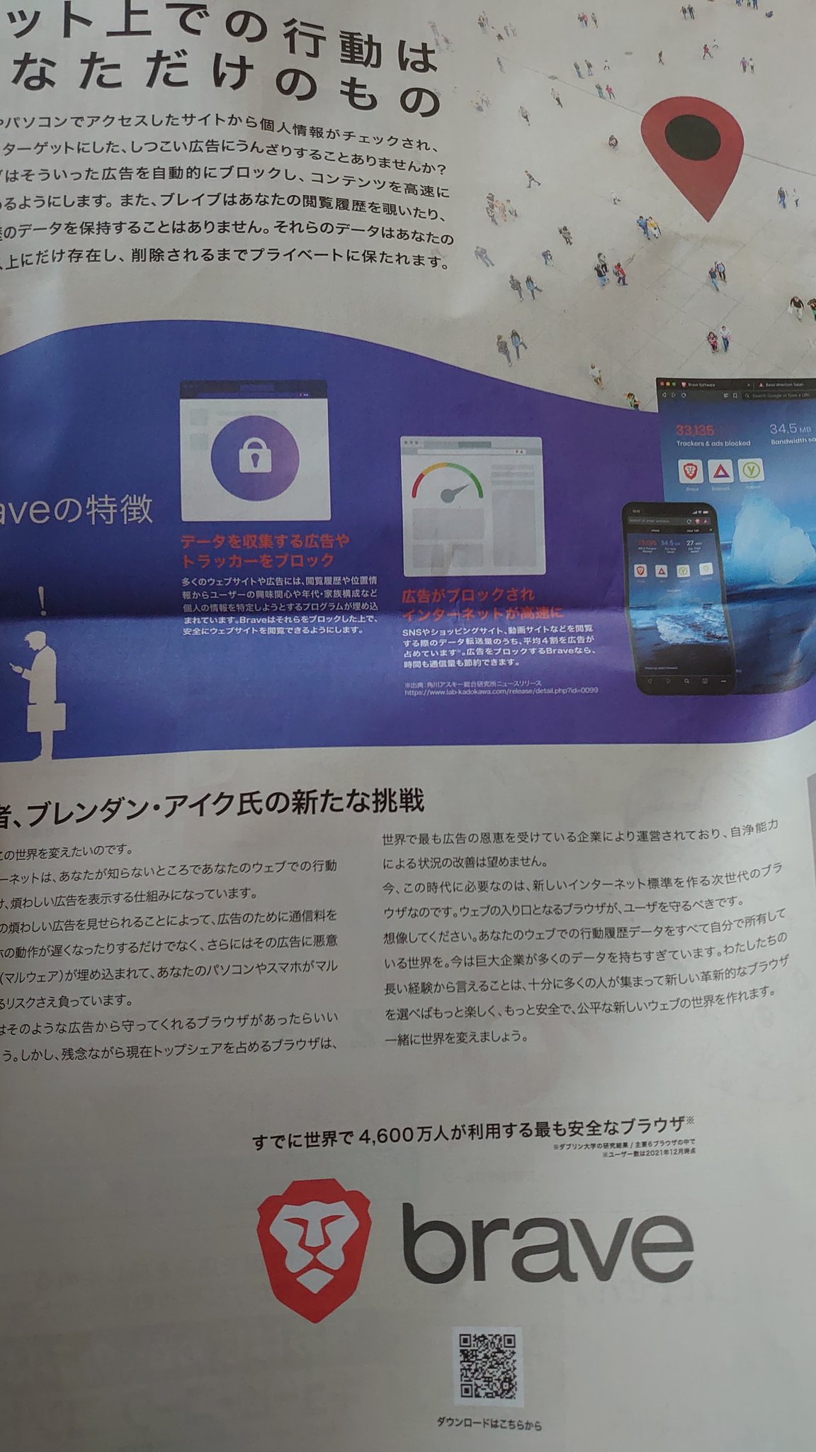 東北地方、主に宮城県で発行されてる河北新報で、元旦の紙面に全面広告があって、なんとBraveブラウザの広告だった。びっくりした。