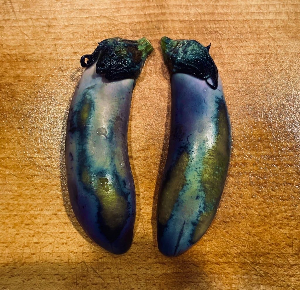 個人的にぬか漬けはカブが一番美味いと思うが、漬けた時の美しさはナスがダントツ。この錆びた金属のような色味は何度見てもうっとりする https://pawoo.net/media/AsUKkbWei8P4S1nFsyU